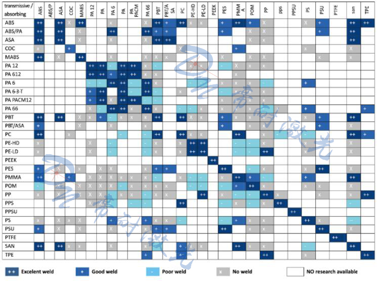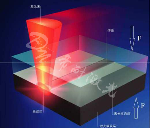 塑料激光焊接原理:通過壓力將兩個待焊接塑料零部件結(jié)合在一起,將一束紅外激光定位于待粘結(jié)部位,激光束透過上層透光材料,被下層材料吸收,吸收的激光能量轉(zhuǎn)換成熱能,由于兩層材料被壓在一起,熱能從吸收層傳導到透光層上,使得兩層材料熔化并結(jié)合。同時由于材料本身的熱膨脹擴張產(chǎn)生內(nèi)部壓力,內(nèi)部壓力與外部壓力共同作用確保了兩部分的堅固焊接。對于產(chǎn)品本身是不吸光的下層材料,需要添加吸收劑進行處理。